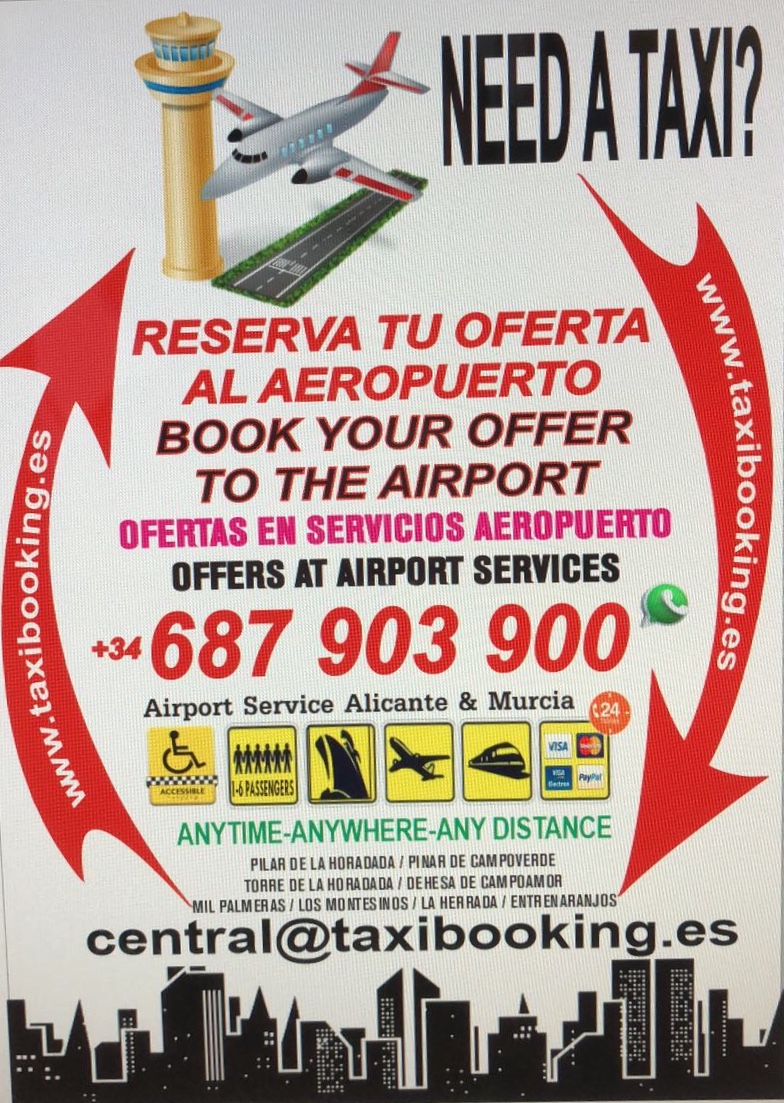 Estimados Amigos y Clientes. Nuestras empresas: Radio Taxi Pilar de la Horadada. Shuttle-Service-Transfers.com Taxibooking.es Pone a su entera disposición los servicios de taxi, Maxitaxi y Eurotaxi, para realizar los traslados y recogidas en aeropuerto Alicante y/o Aeropuerto de Murcia. Con Inicio o Fin: Pilar de la Horadada, Torre de la Horadada, Mil Palmeras, Pinar de Campoverde, Dehesa de Campoamor, Los Montesinos, Cabo Roig, La Zenia, San Pedro del Pinatar, Lo Pagan. Etc… Servicios directos sin intermediarios. Somos una empresa de taxis moderna, cualificada y estamos a su servicio en; Costa Blanca y Costa Cálida. Realizamos todos los traslados de pasajeros que necesite, especializados en: Traslados y recogidas en, aeropuertos, puertos, restaurante, estación tren, estación de autobuses, Hospitales, Ocio, Mensajería urgente, convenciones, eventos, servicio de chofer, Etc... Nuestro equipo de conductores cualificados y atentos, le aportara la máxima atención y confianza que usted merece. Todos nuestros vehículos pasan unas rigurosas inspecciones para estar siempre apunto, para cuando usted nos necesite. Vehículos Modernos y de última generación para respetar al máximo el medio ambiente. Sistemas de seguridad tanto para Bebes y/o personas con movilidad reducida en su propia silla de ruedas. Prestamos servicio 24/7/365. Siempre para la máxima eficacia del servicio, aconsejamos reserven con antelación su servicio. Usted puede hacer la reserva de nuestros servicios con antelación, de esta manera usted estará garantizando una máxima puntualidad y tranquilidad en su servicio. Usted puede Reservar su servicio en nuestros formularios diseñados en nuestra webs, www.radiotaxipilardelahoradada.com www.shuttle-service-transfers.com www.taxibooking.es También puede optar por realizar su consulta o reserva, por vía E-mail: central@taxibooking.es Para cualquier consulta o duda póngase en contacto sin ningún tipo de compromiso. Será un placer poder atenderle. Atentamente un cordial saludo. Juan Sebastián Oliva Jiménez T.M. 0034 - 669 390 301 Central servicios inmediatos: T. 0034 - 96 676 78 30 M. 0034 - 687 903 900 central@taxibooking.es www.taxibooking.es