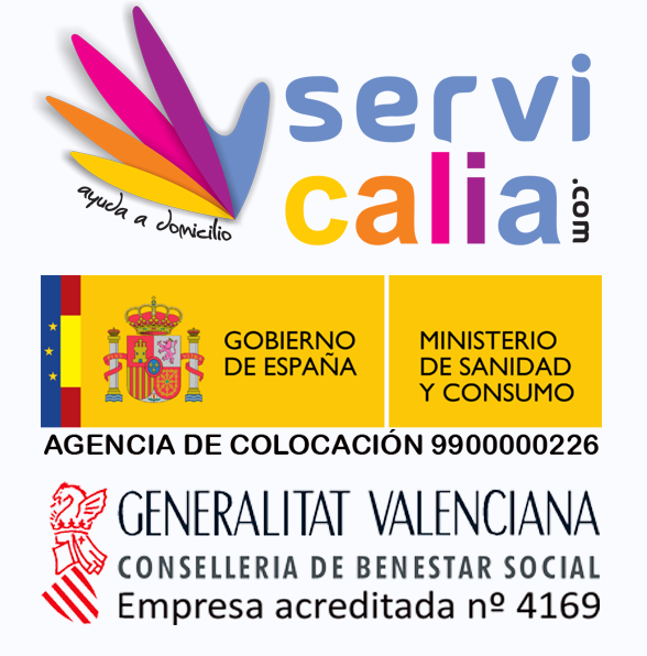 Servicios especializados para el cuidado de mayores en Valencia y demás servicios de asistencia a domicilio. Hoy en día las necesidades del hogar son muchas y contamos con poco tiempo para realizarlas o para encontrar a profesionales de confianza. Por ello, en Servicalia ponemos a tu disposición la profesionalidad de nuestras cuidadoras y profesionales con solo poneros en contacto con nosotros. Nuestros servicios incluyen Internas 24 h., Interna fin de semana, Acompañamiento en Hospitales, Cuidado de Mayores, Acompañamiento en domicilio (diurno y nocturno), Limpieza a domicilio, Planchadoras, Cuidado de niños ... Nos adaptamos a sus necesidades. Nuestras acreditaciones ante la Conselleria de Bienestar social como empresa acreditada numero 4169 para el servicio de ayuda a domicilio, y la autorización del Servef para actuar como agencia de colocación numero 9900000226, avalan y garantizan la profesionalidad de nuestra empresa en el sector de asistencial domiciliario.
