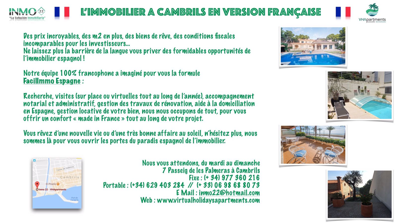 www.inmo22.com "La solución inmobiliaria" Avalados por centenares de clientes satisfechos, el grupo Phenix Venture SL y sus marcas comerciales Inmo22/ VHApartments.com/Century22 es especializado en cualquier tipo de búsqueda inmobiliaria, compra-venta y gestión de alquileres vacacionales, particularmente en las zonas de playa de Cambrils y sus alrededores. Apostando sobre una comunicación en toda Europa a través de nuestros propios portales en Francia y Bélgica, una colaboración en red inter agencias y un presupuesto de publicidad importante en nacional, damos a su vivienda, que sea en venta o en alquiler vacacional una visibilidad máxima. Siempre en búsqueda de nuevas viviendas para nuestros clientes compradores listados, estaremos muy motivados en ayudar les a vender o encontrar la vivienda que busca y así cumplir con los deseos de todos, Vendedores y Compradores. Servicio completo multi-idiomas y asistencia total en todo el proceso de compra-venta. Gestiones notariales, administrativas y jurídicas. Servicio gratuito tasaciones, arquitectura, decoración, presupuestos y reformas. Venta rápida de su vivienda - Gestión con máxima seriedad de su alquiler vacacional. Publicidad gratuita para una máxima visibilidad en todos los portales internacionales y nacionales (consultar lista)