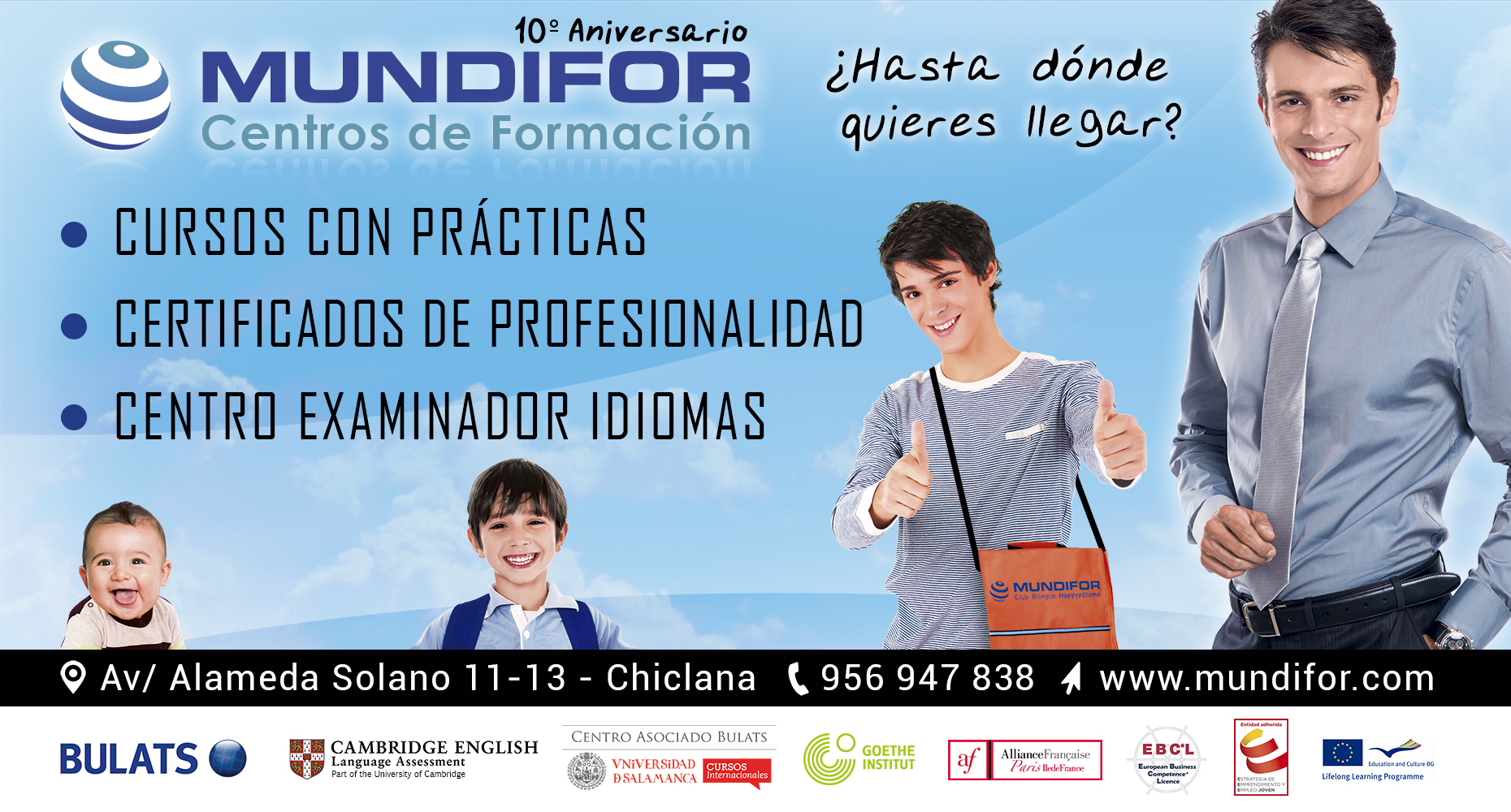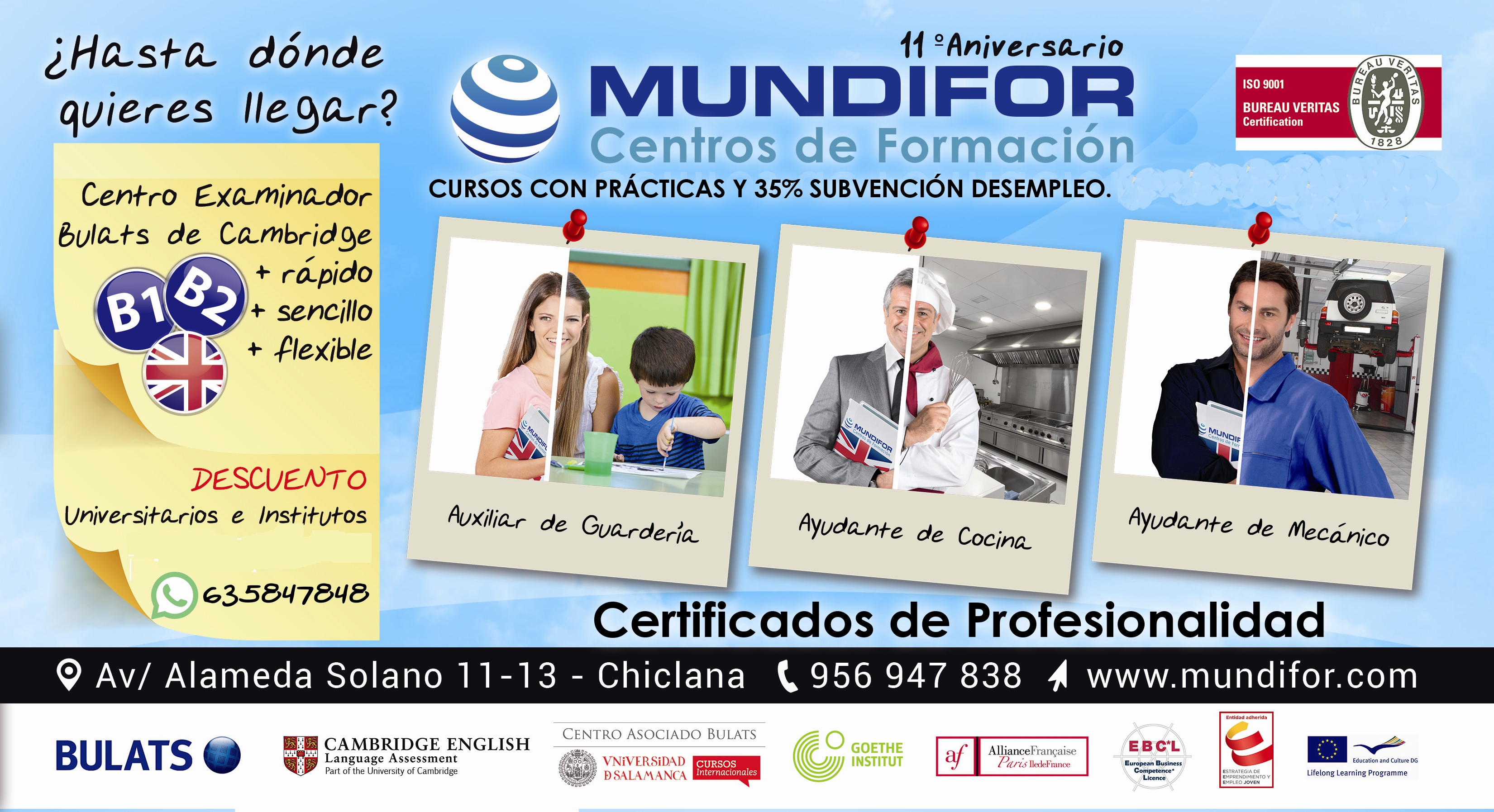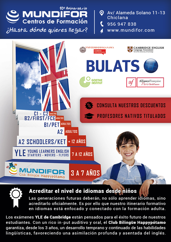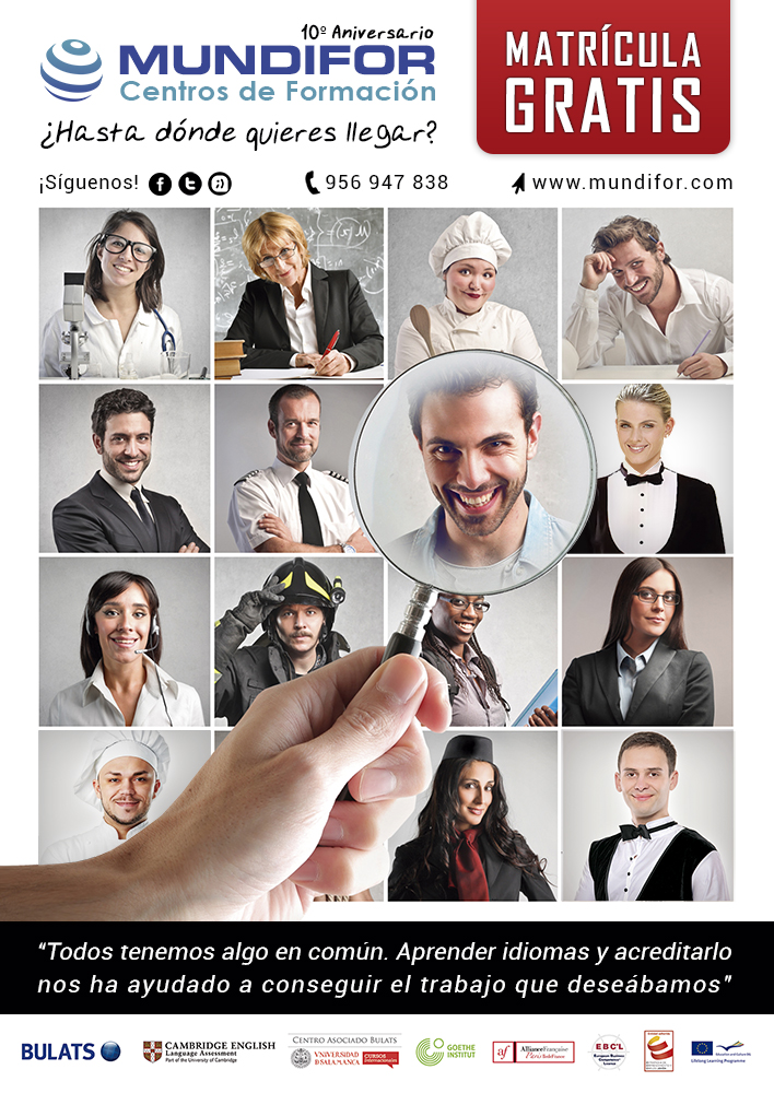 MUNDIFOR nació en 2005 como empresa especializada en servicios para la formación de personas de todas las edades, con la misión de aportar la tecnología, la inteligencia y el talento justos para concretar proyectos educativos sólidos, efectivos y originales en un mundo cambiante. Nuestros valores: Visión, Anticipación, Agilidad, Agudeza, Solidez, Comunidad, Alegría, Liderazgo, Autenticidad. IDIOMAS (inglés, francés, alemán...) EXÁMENES OFICIALES idiomas A1, A2, B1, B2, C1, C2 CURSOS Semipresenciales con PRÁCTICAS en empresas CURSOS ONLINE y a Distancia CERTIFICADOS de PROFESIONALIDAD privados y subvencionados FORMACIÓN PROGRAMADA otros Servicios de Consultoría